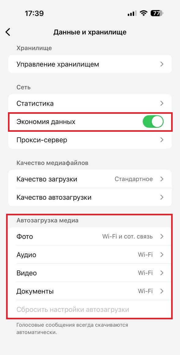 — Открываем приложение и заходим в «Настройки». В разделе «Данные и память» открываем «Через мобильную сеть». Здесь можно изменить параметры автозагрузки медиа. Самый лучший вариант — выбрать низкий расход трафика. В этом режиме приложение будет автоматически загружать только фотографии.